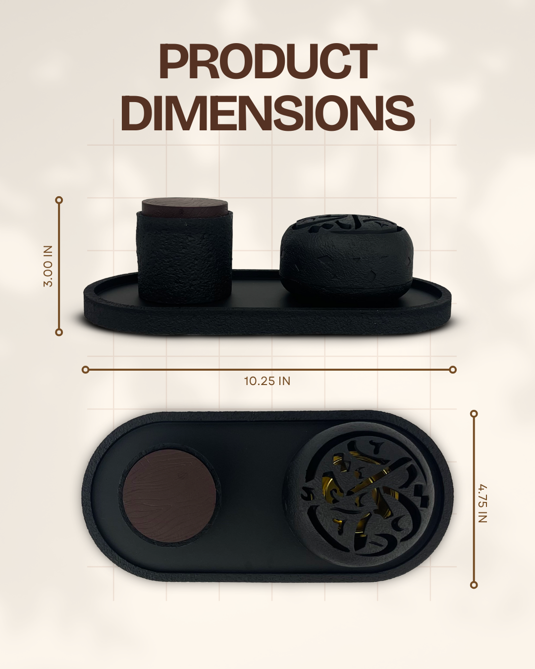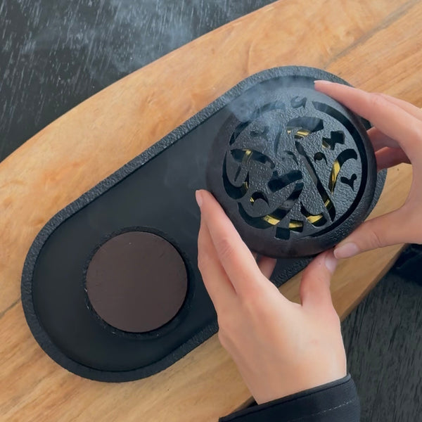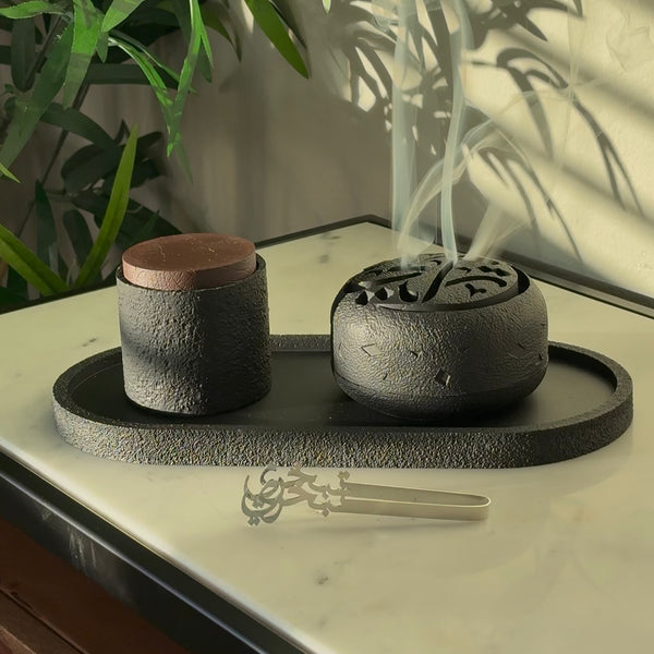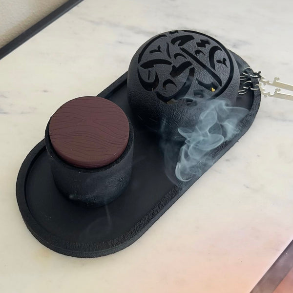 Bring instant calm and modern style to your space with the Midnight Aura Incense Burner Set, a sleek 3-piece set designed for both incense and bakhoor. It keeps everything neat while looking effortlessly elegant on any table, shelf, or coffee corner.